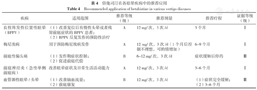 倍他司汀在各眩晕疾病的推荐应用见表4。