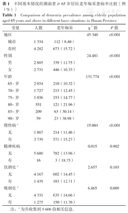 不同地区、性别、年龄、吸烟史及有无慢性病者老年痴呆患病率比较,差异均有统计学意义(P<0.05);不同饮酒史、有无精神疾病者老年痴呆患病率比较,差异无统计学意义(P>0.05),见表1。