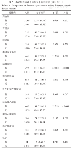 共收集到5 606份慢性病患病数据,0、1、2、≥3种不同慢性病患病数量群体的老年痴呆患病率依次为11.46%(214/1 867)、13.66%(309/2 262)、17.50%(176/1 006)、18.26%(86/471)。随着慢性病患病数量增加,老年痴呆患病率升高(χ2趋势=26.912,P<0.001)。有无胃肠炎、类风湿关节炎、脑血管病、慢性阻塞性肺疾病、缺血性心脏病者老年痴呆患病率比较,差异均有统计学意义(P<0.05),见表3。