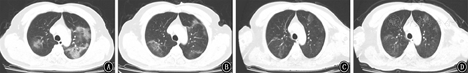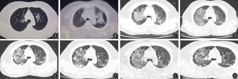 2020年1月24日当地县医院胸部CT示左肺磨玻璃影;右肺中叶条索。1月29日当地县医院CT肺部病变较前明显增多。2月1日衡水市第三人民医院胸部CT示双肺符合COVID-19影像表现[11]。2月9日与2月1日比较,右肺上叶片状阴影范围增大,余双肺病变略显减少。2月13日与2月9日比较,双肺病变范围缩小,双肺病变实性成份增多。2月17日与2月13日比较,双肺病变范围稍缩小,双肺病变实性成份较前稍减少。2月21日与2月17日比较,双肺病变范围稍缩小,双肺病变吸收好转。2月23日与2月21日比较,双肺渗出病变较前吸收、减少,病变范围较前缩小,纤维化较前明显。具体情况见图1。