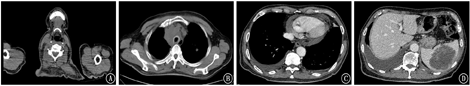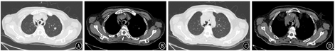 淋巴瘤化疗后出现呼吸道瘘亦有相关报道。Benmoussa等[14]报道1例24岁摩洛哥女性,确诊原发性纵隔大B细胞非霍奇金淋巴瘤,化疗后呼吸困难症状加重,并出现进食后呛咳,食管镜检查发现气管-食管瘘。虽经化疗及内镜下植入支架治疗,患者最终仍死亡。Hendarsih等[15]报道1例43岁男性患者,确诊为非霍奇金淋巴瘤并行1个疗程CHOP方案化疗后,出现呼吸困难和咳嗽,X线胸片发现自发性支气管胸膜瘘,经胸腔置管引流治疗1个月,患者气胸好转,并可继续进行后续疗程化疗。本例患者为弥漫大B细胞性非霍奇金淋巴瘤化疗后出现多发气管/支气管-纵隔瘘,未检索到同样的病例,故作报道。