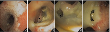 2018年5月23日复查胸部CT提示:淋巴瘤治疗后,气管瘘、纵隔瘘;纵隔、右侧锁骨上窝多发肿大淋巴结,双肺多发结节,脾脏占位,符合淋巴瘤,部分较前减小;双肺感染较前加重,双肺下叶膨胀不全;新增双侧胸腔积液;心包少量积液,较前相仿(图2)。2018月5月25日支气管镜见气道内弥漫白斑、黏膜糜烂,气管中段见巨型气管-纵隔瘘,左主支气管见3个瘘口,右上叶见1个瘘口(图3)。患者治疗过程中新发气管、支气管-纵隔瘘,考虑为原淋巴瘤浸润,累及纵隔及邻近的气管、支气管;化疗后,肿瘤组织消减,导致气管、支气管与纵隔间出现相通的窦道。患者气道弥漫性糜烂、多发巨型瘘口,难以自行愈合。目前气道内介入治疗方法,如气道支架、封堵器等不能解决瘘口问题,且支架、封堵器等机械压迫可能使原有气管/支气管瘘扩大。考虑患者气管/支气管-纵隔瘘虽存在,但纵隔内气体尚未引起心脏和纵隔大血管压迫;且瘘口未与食道相通,未引起难治性肺部感染等危及生命情况,决定采取保守治疗方式,继续予抗感染(产气肠杆菌和放线菌)及对症支持治疗。患者症状好转于2018年6月5日出院。但患者因个人因素,放弃进一步治疗,并于出院后2个月去世。
