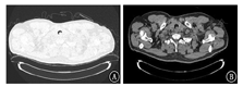 患者男,51岁,回族,因"咳嗽、咳痰、气短4个月,加重伴喘息1周"入院。患者4个月前出现刺激性咳嗽、咳痰,痰黏不易咳出,活动后喘息、气短。曾在当地医院多次行胸片检查未见明显异常,考虑"支气管哮喘",给予布地奈德福莫特罗粉吸入剂(商品名信必可)吸入、多索茶碱颗粒口服及抗感染治疗,症状未得到缓解。行胸部CT检查,未见明显异常(具体不详),仍考虑"哮喘",继续给予上述治疗,患者症状逐渐加重。入院前1周,患者在静息状态下即有明显喘息,可闻及喘鸣音,不能活动,遂急诊入住兰州大学第二医院呼吸内科。入院后追问病史,患者5个月前曾因车祸致意识丧失、呼吸衰竭入住兰州大学第二医院ICU,胸部CT提示左侧多发肋骨骨折、胸骨柄骨折、双肺挫裂伤、双侧中量胸腔积液。行气管插管呼吸机辅助通气及相关治疗20余天好转出院。既往体健。体格检查:一般情况良好,意识清楚,唇甲轻度发绀,颈部未见明显淋巴结肿大。胸腹反常呼吸运动,有"三凹征"。听诊喉部可闻及喘鸣音,双肺可闻及吸气相哮鸣音。心率116次/min,心音低钝,心律齐。其余未见明显异常。入院后心电图、血常规及凝血功能检查均正常,动脉血气分析:pH7.34,PaO2 68 mmHg(1 mmHg=0.133 kPa,吸氧6 L/min),PaCO2 50 mmHg。急诊行颈胸部CT平扫,提示声门下气道内占位性病变(图1),初步诊断为气管内肿瘤。