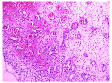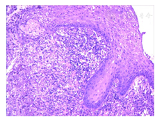 患者仰卧位,常规监测心率、血压、呼吸、SpO2,配备相关抢救设备及药品,于咽部2%利多卡因局部喷雾麻醉,麻醉医师经静脉缓慢推注丙泊酚1~3 mg·kg-1·h-1和瑞芬太尼2 μg/kg,以患者的咳嗽体动反应情况为依据,为其间断追加丙泊酚0.5~1 mg/kg。患者意识消失、睫毛反射消失后,经口置入三通喉罩连接麻醉机控制呼吸。操作医师经喉罩进入气管镜(型号:Olympus BF-1TQ290),术中严密监测生命体征。镜下见声门下约0.5 cm处一类圆形新生物,表面光滑,管腔重度狭窄,从工作通道送电凝电极至新生物表面作点状电凝治疗(功率35~40 W),出血较少,继续烧灼治疗后管腔明显通畅,新生物缩小至原来的25%,气管镜可顺利进入,见气管下段、左右主支气管及远端支气管管腔黏膜均正常。患者清醒后自觉喘息、气短症状明显缓解。3 d后再次行气管镜检查并钳夹清理烧灼区域坏死物质,近基底部新生物予以氩等离子体凝固术治疗,共治疗2次后,管腔基本通畅(图4)。术后1个月复查气管镜见声门下6点钟方向米粒大肉芽突出于管腔,活检钳钳夹肉芽组织再次送检(图5)。病理提示:送检物为黏膜组织、炎性肉芽组织及坏死、炎性渗出物(图6)。术后4个月患者无喘息症状,复查气管镜可见管腔基本通畅,原新生物基底部轻度瘢痕形成(图7)。
