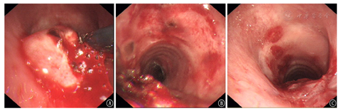 以往对于良性中心气道狭窄的治疗多为外科切除和手术重建[5,6,7,8]。但开胸手术损伤较大,围手术期并发症多,费用昂贵。加之部分患者病变部位解剖学的限制,使得外科手术的适应证非常有限。近几年来随着呼吸介入治疗技术的快速发展,内镜介入治疗已经成为良性中心气道狭窄的主要治疗方式[9],已基本取代传统的外科手术,支气管镜下圈套器切割配合冷冻、高频电凝消融或激光操作简便,起效快,费用低,术后并发症少[10,11]。