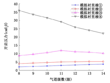 注:模拟衬里液①γ=25 dyn/cm,μ=0.01 P;模拟衬里液②γ=25 dyn/cm,μ=0.1 P;模拟衬里液③γ=25 dyn/cm,μ=1 P;模拟衬里液④γ=25 dyn/cm,μ=10 P;γ为衬里液表面张力;μ为衬里液粘度;1 cmH2O=0.098 kPa