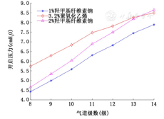 图5和图6表示假塑性非牛顿流体气道衬里液表面张力和流变学特性对气道开启压力的影响。注意到3种衬里液的表面张力相当(约60~70 dyn/cm),尽管2%羧甲基纤维素钠的黏稠度(255.1 dyn/cm2·sn)数值上约为3.2%聚氧化乙烯(41.9 dyn/cm2·sn)的6倍、1%羧甲基纤维素钠(24.9 dyn/cm2·sn)的10倍,但由于强烈的剪切稀化效应(幂率指数n=0.375),使得其对应的各级气道开启压力并没有明显地高于其他两种衬里液填充下的气道开启压力。其次,仔细比较模拟衬里液④(图4)与2%羧甲基纤维素钠(图5),发现尽管后者表面张力和黏稠度均大于前者(表面张力50 dyn/cm比68 dyn/cm;黏稠度10 dyn/cm2·sn比255.1 dyn/cm2·sn),但后者对应的各级气道开启压力(均不超过10 cmH2O)却明显地低于前者(均大于35 cmH2O),进一步证明了假塑性非牛顿流体存在的剪切稀化效应使得气道开启压力减小。最后,比较图5与图6可知,气道开启压力随假塑性非牛顿流体衬里液膜厚度H的增加而升高。