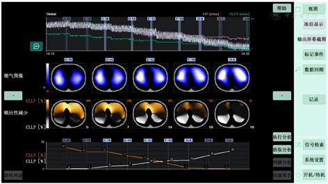 COPD主要是由小气道阻塞造成的呼气流速受限和气体陷闭,严重时可能需要机械通气的支持,若参数设置不当可能会导致内源性呼气末正压(positive end expiratory pressure,PEEP)的增加,进而影响人机同步甚至血流动力学。临床中为了避免由于参数设置不当而导致内源性PEEP增加,通常会通过呼吸力学和监测血气来指导和优化机械通气参数的设置,但由于无创正压通气允许漏气且患者存在自主呼吸,所以测得的力学参数并不可靠。在一项应用EIT评估严重呼吸衰竭的区域呼气时间常数的可行性研究[8]发现呼吸机PEEP的设置与区域呼气时间常数有较高的相关性,且在Kostakou等[9]的研究中证实区域呼气时间常数指导的机械通气参数设置对COPD患者有减少过度通气、死腔和呼吸做功的作用。同时在1例应用EIT监测COPD患者进行PEEP递减操作过程中发现,当外源性PEEP下降至患者内源性PEEP以下时,其EELV就会停止下降,通过此种方法与传统测定内源性PEEP来设定外源性PEEP的方法有较好的一致性[10],笔者团队结合EIT的优势及临床经验对1例应用无创正压通气的COPD患者进行呼气压力的指导,也收获了很好的临床效果。所以EIT有助于优化应用无创正压通气COPD患者的外源性PEEP设置。