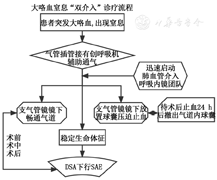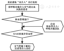 肺曲菌球[42]反复感染可能导致威胁生命的大咯血,曲菌球多继发于肺结核、肺脓肿等结构性肺病,由于肺结构破坏而形成瘢痕,全身用药很难有效渗透,故内科药物治疗效果差,且此类患者多肺功能储备能力差,大多无法耐受外科手术,此时气道介入可取得有效的治疗效果[43],其介入治疗方法有:(1)支气管镜直视下活检钳将曲菌球夹散、吸出,清除肺空洞内曲菌球;(2)镜下直接注药治疗。但由于肺曲菌球患者多合并咯血,且在腔内治疗时极易合并大咯血,可先行SAE栓塞责任血管,再联合行支气管镜下介入治疗,如果空洞位于肺外周,支气管镜无法到达,可先将支气管镜送至病灶近端支气管,在数字减影血管造影透视下从支气管镜操作孔注入碘对比剂,选择进入空洞的路径,再送入鞘管至远端空洞附近或直达空洞内,进行药物灌注,两种介入技术结合具有安全性高、耐受性好、术后恢复快、对肺功能储备要求低及并发症少等优势。具体流程见图4。