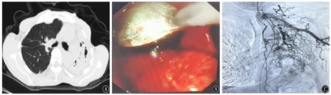 咯血是呼吸系统的危急重症,与其他部位出血不同,少量的血凝块即可能堵塞气道从而危及患者生命,病死率超过70%[39]。一次咯血量超过200 ml或24 h咯血量超过500 ml为大咯血[40]。大咯血最严重的并发症是窒息,最重要的处理措施是尽早畅通气道及立即阻断出血[19]。SAE联合呼吸内镜介入技术在大咯血的诊治中具有很好的临床作用:对于发生窒息性大咯血,且氧饱和度<90 mmHg(1 mmHg=0.133 kPa)时,患者生命体征不稳定,立即行血管介入止血存在风险,此时呼吸内镜联合肺血管介入诊疗至关重要。首先快速气管插管,建立有效人工气道,即刻使用支气管镜快速清除气道内血凝块畅通气道,还可以明确出血部位并局部止血,必要时放置球囊压迫止血,保护健侧肺,并为血管介入诊疗争取时间。在生命体征稳定后,即刻至导管室行SAE进行病理血管的栓塞进行止血治疗,在某些复杂的病变如毁损肺、血管非常纤细、异位支气管动脉或非支气管性体动脉参与病灶供血等情况下,容易出现病理血管遗漏,在行SAE术中或术后再同台行支气管镜检查,有助于寻找目标血管,可提高手术成功率,减少复发率。笔者单位的研究[41]显示:153例因支气管扩张症导致的咯血患者术后2年仅有16例复发,复发率为10.5%,分析原因考虑运用了肺血管介入和呼吸内镜介入联合治疗即"双介入"治疗手段。具体流程见图1。病例1:女性患者,86岁,因"间断咯血1月余"入院。患者有大咯血窒息,总出血量约1 000 ml。联合治疗情况见图2。