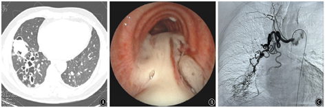 对于重症感染的患者,需反复行支气管镜灌洗治疗清除支气管内脓性分泌物,可有效防止感染扩散,解除气道阻塞,减少细菌对支气管的炎性损伤,且由于支气管扩张症患者存在潜在致病菌的定植,支气管镜检查还可留取气道内标本行病原学检查,明确病原菌,指导临床用药,减少耐药菌的产生。但支气管扩张症患者大多伴有支气管动脉或非支气管性体动脉扩张以及末梢血管床增生,极易合并危及生命的大咯血,行支气管镜检查及治疗存在一定风险,而血管介入为支气管镜的运用提供了保障。先行血管增强CT了解患者的体动脉情况,然后通过SAE栓塞异常血管,可起到即时止血的作用,之后再行支气管镜诊疗。这样,在能确保患者安全的情况下,进行气道介入治疗以达到预期的临床效果,即提高疗效,缩短住院时间,减少感染复发。病例2:男性患者,62岁,因"咳嗽、咳痰伴发热1周"入院,既往有支气管扩张症病史。联合治疗情况见图3。