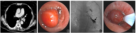 对于气道内占位性病变,需行支气管镜下活检以明确病理性质,当肿瘤压迫气道出现呼吸困难还需镜下介入切除以缓解症状,此时为减少活检或瘤体切除过程中的出血风险,可先行支气管动脉增强CT,观察瘤体供血血管是否丰富,对供血丰富的血管行肺血管介入治疗,栓塞责任血管,减少大咯血的风险,从而安全地取得病理组织或切除肿瘤。