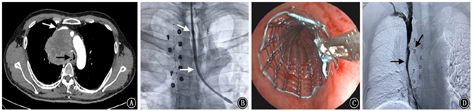 若良、恶性肿瘤同时压迫了上腔静脉和气道,通常会出现明显呼吸困难、头面部及上肢肿胀、胸壁静脉曲张及中枢神经等症状,严重时可导致猝死,而此类患者多属晚期肿瘤不适合行外科手术切除肿瘤,内科药物治疗效果欠佳。对于此类患者,可以联合血管介入和内镜介入,同台置入气道支架和上腔静脉支架,缓解气道阻塞和上腔静脉阻塞。若还未明确肿瘤性质,同时还可以进行SAE栓塞肿瘤供血血管,再行气道内活检,联合操作可缩短患者诊治周期,提高安全性。但目前对于双支架的临床报道多为个案或病例系列报道,尚缺乏随机对照研究,也缺乏评估血管或气道狭窄患者的动力学的指标来评估有效性,还需要进一步研究。具体流程见图6。病例4:男性患者,64岁;因"憋喘伴颜面水肿3 d"入院,既往确诊为肺鳞癌;胸部CT提示肿块明显压迫气道及上腔静脉。见图7。