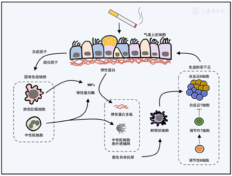 注:MMPs为基质金属蛋白酶;COPD为慢性阻塞性肺疾病;实线表示COPD中可能增强的免疫反应过程;虚线表示可能缺失的免疫反应过程