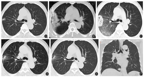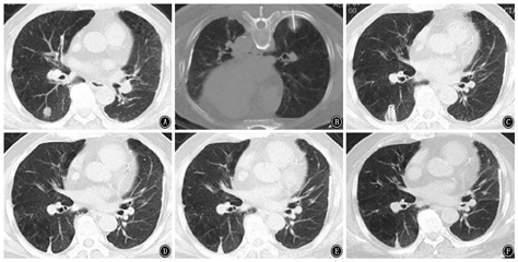 近年来,陆续有介入消融技术治疗GGN型肺癌的报道。RFA治疗GGN型肺癌的2年总生存率、CSS分别可达95.8%、100%[22]。MWA治疗GGN型肺癌也获得令人满意的生存获益,3年无局部进展生存率可达98%,3年CSS率可达96%[23];而且,MWA在多发GGN型肺癌的治疗中也有报道,中位随访18个月内未见肿瘤复发[24]。AHC治疗GGN型肺癌也有少量报道,一项回顾性研究纳入14例接受AHC治疗的GGN型肺癌患者,2年随访期内未见肿瘤复发[25]。这些研究报道中均未发生严重并发症。本中心也对部分GGN型肺癌患者进行了消融治疗,典型病例见图2。