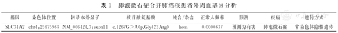 | SLC34A2 | chr4:25675968 | NM_006424.3;exon11 | c.1267G>A(p.Gly423Arg) | hom | 0.0000637 | 预测为有害 | 肺泡微石症 | 常染色体隐性遗传 |