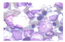 患者女,58岁。因反复多关节肿痛16年,发现外周血嗜酸性粒细胞升高3个月入院。患者多关节肿痛16年,对称性累及双肩、双腕、双肘、双踝、双侧跖趾关节,每次持续时间>6周,ESR及CRP均升高,诊断为RA。曾口服甲氨蝶呤片、雷公藤多苷片、白芍总苷胶囊治疗,关节症状可缓解。入院前长期规律口服雷公藤多苷片20 mg,每日2次,10年余。近3年监测RF波动于240~648 U/ml。入院前3个月无明显诱因出现外周血嗜酸性粒细胞升高,达2×109/L,比率25.9%。RF 2 220 U/ml,ESR 14 mm/1 h,CRP 0.92 mg/ml。患者无明显关节肿痛,但因RF明显升高,停用雷公藤多苷,改为来氟米特10 mg每日1次治疗。1个月后患者出现低热,体温最高37.5 ℃,无皮疹及关节肿痛等其他不适,复查外周血嗜酸性粒细胞达6.24 × 109/L,比率57.2%,遂停用来氟米特,入院治疗。入院查体:体温37 ℃,左颈前可触及一肿大淋巴结,直径约1 cm,质软,无压痛,活动度可,全身皮肤无紫癜和皮疹。双腕关节强直,右踝关节轻度水肿,其余关节无红肿热痛。心肺腹查体正常。实验室检查:多次复查外周血嗜酸性粒细胞进行性升高,最高达10.62×109/L,比率63.1%,血红蛋白及血小板正常。ESR 39 mm/1 h, CRP 1.91 mg/ml, IgA、IgG、IgM正常,IgE 227 U/ml。补体C3、C4正常。粪便找虫卵(-)。肝功能、肾功能及尿常规正常。RF 708~839 U/ml。ANA 1∶40阳性(颗粒型),抗dsDNA抗体、抗ENA抗体、ANCA均为阴性。FIPIL1-PDGFRA融合基因阴性。过敏原检测(-)。骨髓象:骨髓增生活跃,M∶E=3.2∶1,嗜酸性粒细胞增多占29% ,嗜酸性粒细胞各阶段均可见,其他各系未见明显异常(图1)。血涂片:嗜酸性粒细胞明显增多,占50%,余未见明显异常。骨髓活检:造血组织占40%,粒红比例大致正常,嗜酸性粒细胞增生,少量淋巴细胞浸润。肺CT:双肺下叶胸膜下少量纤维化。DAS28评分2.98分,HAQ评分0分。临床诊断:嗜酸性粒细胞增多症、RA。入院后予甲泼尼龙80 mg,每日1次,静脉滴注3 d,并规律减量,激素治疗6 d后复查外周血嗜酸性粒细胞正常。出院后共随访11个月,激素共使用8个月,激素使用4个月后加用雷公藤多苷片20 mg每日2次,患者无明显关节疼痛,外周血嗜酸性粒细胞正常,RF显著下降,末次RF 488 U/ml。