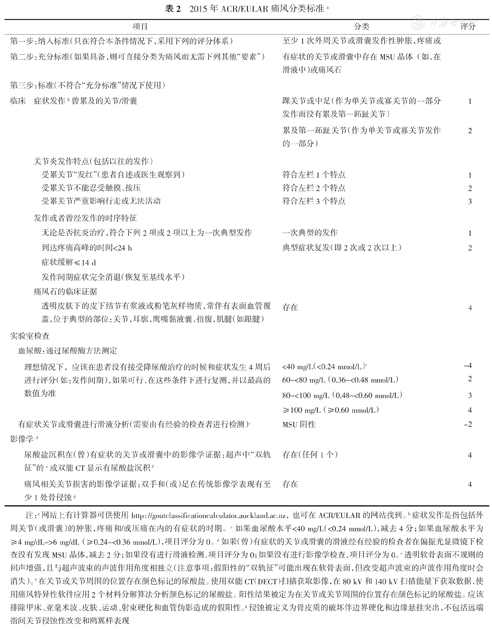 同以往标准制定相同,2015年标准的制定汇集了美国、欧洲、澳洲的多位痛风研究专家,同时还纳入了2名社区医生。通过以下3个阶段最终形成本标准:第1阶段:通过Delphi法,确定对诊断和鉴别诊断有帮助的"要素",并且通过一个横断面研究(study for updated gout classification criteria, SUGAR)确定新的痛风分类标准中需要考虑的条目,同时对影像学诊断的价值进行文献复习;第2阶段:由于标准制定中可能存在选择性偏倚,纳入的病例大多为单钠尿酸盐(monosodium urate monohydrate,MSU)晶体检查阳性的患者,或者到风湿病专科就诊的患者,通过这一阶段的研究进一步的甄别、分析。主要通过对纸质病例的分析、专家会议等形式最终确定诊断"要素";第3阶段:通过与以往标准的比较,确定分类标准的"阈值",并且在另外一组病例中进行验证;进一步分析新标准的敏感度和特异度,最终形成2015年分类标准(表2)。