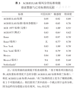 在SUGAR研究的验证(330例)结果提示:完整版新分类标准敏感度为0.92,特异度为0.89。而仅采用"临床参数"进行验证,即不考虑实验室参数(尿酸、MSU晶体)和影像学参数(X线,超声或双能CT影像)的情况下,敏感度和特异度分别为0.85和0.78。与既往的痛风分类标准比较,2015年ACR/EULAR痛风分类标准(完整版和临床参数版)均具有较好的表现(表3)。