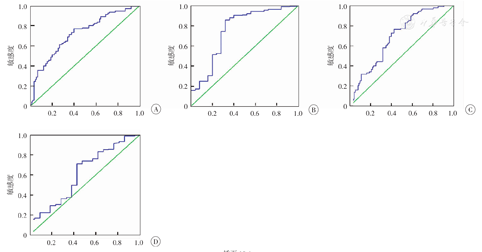 使用前臂骨密度诊断腰椎和左髋骨质疏松,ROC曲线下面积分别为0.757 (95% CI:0.638,0.876)和0.615 (95% CI:0.481,0.749),诊断腰椎和左髋骨量减少的ROC曲线下面积分别为0.725 (95%CI:0.651,0.798)和0.758 (95% CI:0.688 ,0.828 )。使用前臂骨密度诊断腰椎和左髋骨质疏松的最佳T值分别为-3.52(敏感度为0.865,特异度为0.501)和-2.50(敏感度为0.662,特异度为0.762),使用前臂骨密度诊断腰椎骨量减少的最佳T值为-2.23(敏感度为0.714,特异度为0.689);使用前臂骨密度诊断左髋骨量减少的最佳T值为-2.08(敏感度为0.719,特异度为0.728)。见图1。