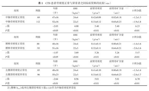 CTD患者骨密度正常与异常者之间临床资料的比较(