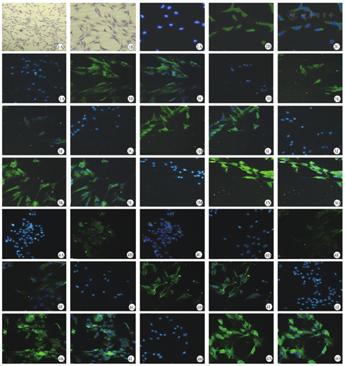 软骨细胞以5×103个/ml种板,待细胞贴壁后,PBS洗涤3次,予4%多聚甲醛固定20 min。PBS洗涤3次,予0.25% Triton室温通透20 min,PBS洗涤3次,予10%山羊血清封闭1h后,加入Ⅱ型胶原一抗(兔抗大鼠1∶100)后4 ℃过夜,次日弃去一抗,PBS洗涤3次后加入羊抗兔FITC标记的二抗(1∶100)37 ℃孵育50 min后弃去二抗,PBS洗涤3次,予4,6-联脒-2-苯基吲哚二盐酸盐(DAPI)(5 μg/ml)细胞核染色10 min后,PBS洗涤3次,荧光显微镜下观察拍照。