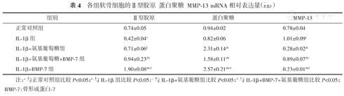 各组Ⅱ型胶原、蛋白聚糖的mRNA相对表达量比较:氨基葡糖组、BMP-7组及氨基葡糖+BMP-7组与IL-1β组相比较mRNA表达均呈上调趋势,组间比较差异均有统计学意义(P<0.05);其中,单独的BMP-7组上调最明显(见表4)。