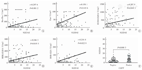 总之,本研究结果显示:Bio-Plex在兼顾特异度和敏感度、以及与疾病活动性和肾脏受累的相关性方面的综合表现优于Farr、ELISA、化学发光方法,对于抗dsDNA抗体检测具有较高的临床价值。特别需要指出的是:Bio-Plex在检测抗dsDNA抗体方面,合并LN的SLE患者抗dsDNA抗体表达量高于单纯SLE患者,2组间差异具有统计学意义,而其他方法均无此现象。一方面可能是由于这种新的检测方法确实在反映肾脏功能方面略有优势,并非是合并LN后此抗体检出率增高,而是此抗体定量值高,合并LN的风险可能增加,但是否真的存在这样的关系,还需要我们作更深一步的研究;另一方面可能由于样本量不足导致结果的偏差,我们下一步工作将继续扩大样本量来进行验证。HOB(中国)是国内首家将化学发光技术运用在自身抗体检测领域,其仪器、试剂本土化有利于降低成本和临床普及,并且与Bio-Plex一样均可很好地实现全自动化、标准化、精确化检测。作为国家"863"计划重大科研项目,在自身抗体检测的自主研发工作中取得了重大突破,通过对其产品进行不断的优化、改良,相信国产试剂也可以达到国际同类产品水平。除本实验列出的实验数据外,各群检测方法针对抗dsDNA抗体的检测,与其他一系列狼疮活动相关的临床实验室指标,如C3、C4及免疫球蛋白等的相关性,后续将进一步扩大探讨。