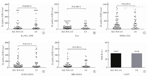 见图2。BioPlex检测结果与疾病活动度(SLEDAI)有较强的相关性(r=0.297 6,P=0.001 2)。CLIFT阴性组及阳性组间SLEDAI评分也有统计学意义(P=0.000 3)。SLE(78例)伴或不伴LN(41例)2组人群中抗dsDNA抗体表达量结果见图3。BioPlex检测表达量在2组人群中差异有统计学意义(P=0.026 8),其余各法在2组人群中无统计学意义。