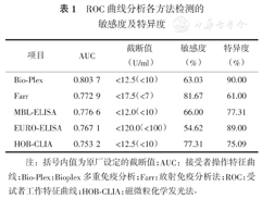 注:括号内值为原厂设定的截断值;AUC:接受者操作特征曲线;Bio-Plex:Bioplex多重免疫分析;Farr:放射免疫分析法; ROC:受试者工作特征曲线;HOB-CLIA:磁微粒化学发光法-