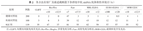 各方法在原厂及最适截断值下各群组中抗dsDNA抗体阳性率统计(%)