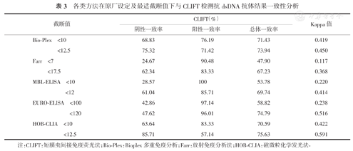 各类方法在原厂设定及最适截断值下与CLIFT检测抗dsDNA抗体结果一致性分析