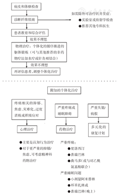 根据专家意见,新版管理推荐意见认为纤维肌痛的治疗应以提高生活质量为目的,及时诊断,具体治疗方案应在医生与患者共同决定的基础上,采取循序渐进的步骤。首先是患者教育和非药物疗法(锻炼),患者教育应提供给患者关于疾病的信息,包括介绍疾病的书面材料,并且对患者的疼痛、体能和社会心理状态进行综合评估;同时基于实用性、费用、安全性和患者意愿,首先应采用非药物治疗。如果无效,进一步的治疗(均为弱推荐)则应根据患者的具体情况考虑以下治疗方法:心理治疗(用于伴有情绪障碍或对应对措施无效的患者),药物治疗(用于有严重疼痛或睡眠障碍的患者),以及/或者多元化康复治疗(用于严重失能的患者),具体推荐意见见表1,疾病的诊疗流程见图1。
