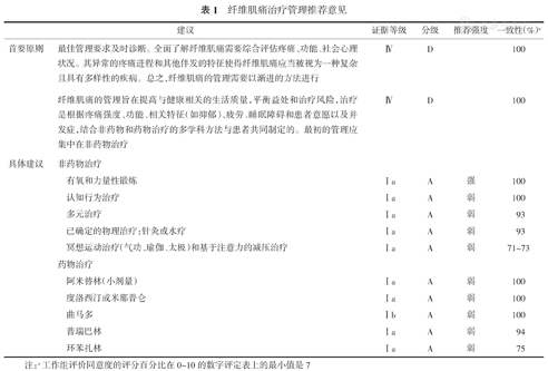 | 首要原则 | 最佳管理要求及时诊断。全面了解纤维肌痛需要综合评估疼痛、功能、社会心理状况。其异常的疼痛进程和其他伴发的特征使得纤维肌痛应当被视为一种复杂且具有多样性的疾病。总之,纤维肌痛的管理需要以渐进的方法进行 | Ⅳ | D | 100 | ||