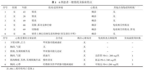 报道并总结3例PM并发心肌炎以及3例恶性肿瘤患者接受免疫检查点抑制剂(ICI)治疗后并发肌炎/心肌炎的临床表现、实验室检查结果、影像学表现、治疗措施及转归。6例患者均为女性,3例PM患者并发心肌炎的年龄范围为28~49岁;3例恶性肿瘤患者使用ICI治疗后出现心肌炎的年龄46~69岁。大部分患者表现为胸闷、气促、乏力,1例恶性肿瘤患者无明显不适。3例恶性肿瘤者均使用抗PD-1抗体,其中2例使用1次后20余天出现心肌炎症状,另1例使用5次后出现心肌炎。6位患者的肌酶及心肌标志物均升高。心脏磁共振(CMR)显示5例患者出现心肌水肿伴延迟强化。3例PM患者用足量激素治疗后均明显好转;而2例ICI治疗患者用甲泼尼龙静脉冲击治疗后无明显缓解,其中1例患者接受血浆置换2次,2例患者加用人免疫球蛋白治疗,3例患者均口服托法替布治疗。最终所有患者治疗后症状及实验室指标均得到改善。ICI相关心肌炎普遍要比PM相关心肌炎症状重、进展快,对激素的反应差,及时采用多种免疫抑制治疗手段,可取得满意的效果。