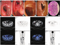 入院后查血常规:红细胞计数4.5×1012/L,血红蛋白126 g/L,白细胞计数5.78×109/L,血小板计数211×109/L,大便常规正常,隐血试验呈阳性。白蛋白31 g/L。免疫球蛋白(Ig)G为5.56 g/L。ESR 72 mm/1 h,CRP 58 mg/L。尿常规、大便细菌培养、男性肿瘤指标、结核感染T细胞检测、自身抗体检验、抗磷脂抗体、ANCA等检查均正常。纯蛋白衍生物(PPD)试验阴性。正电子发射计算机断层显像(PET)-CT结果显示小肠、升结肠见多处局限性略增厚,氟脱氧葡萄糖(FDG)代谢不均匀,最大标准化摄取值(SUVmax)值为4.6,考虑为炎性改变(图3)。确诊为重症/难治性肠型白塞病。入院后第4天,调整治疗方案为泼尼松20 mg/d,联合SSZ 1.0 g每日2次,沙利度胺50 mg/每晚,同时给予英夫利昔单克隆抗体(IFX)200 mg治疗,患者出现全身性皮疹,伴有明显瘙痒,考虑为药物不良反应停用。后接受酪氨酸蛋白激酶(JAK)1/3抑制剂(托法替布5 mg每日2次)治疗,治疗1周左右,患者腹痛症状明显减轻,炎症指标明显降低。治疗4个月后,DAIBD评分明显改善,炎症指标降至正常,复查肠镜提示肠道溃疡完全愈合(图1C,图1D),激素逐渐减量,于2020年4月停用激素,托法替布减量至5 mg/d,随访至今,患者病情处于持续缓解状态。在治疗期间,记录DAIBD评分、ESR、CRP和糖皮质激素剂量的变化。本研究遵循的程序符合负责人体实验委员会所制定的伦理学标准(372),并得到该委员会的批准,所有临床数据信息的采集及药物应用均取得患者的知情同意。