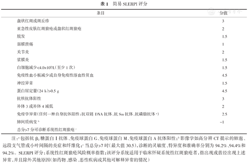 SLE临床表现具有明显异质性,不同症状及免疫学特征可逐渐出现,增加了早期识别的难度。SLERPI评分可以帮助临床医生早期识别SLE以及重症狼疮患者,早期干预、早期治疗,改善患者的预后。