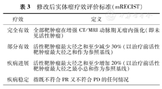 增强CT/MRI是评价局部疗效的标准影像学方法,超声造影也可应用,有条件者还可联合PET-CT。2010年修改后实体瘤疗效评价标准(modified response evaluation criteria in solid tumors, mRECIST)提出了活性肿瘤(viable tumor)概念,即在增强CT/MRI动脉期强化的肿瘤组织,表现为偏心、散在、结节状不规则强化。循此概念重新定义完全有效(complete response,CR)、部分有效(partial response,PR)、疾病稳定(stable disease,SD)和疾病进展(progressive disease,PD)(表3)。