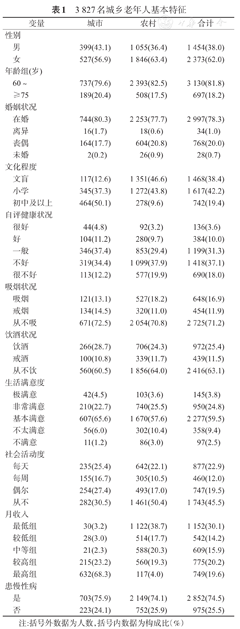 共3 827名老年人纳入分析。城市老年人平均年龄(68.9±6.59)岁,女性占56.9%,低龄老年人占79.6%,在婚者占80.3%,受教育程度为初中及以上者占50.1%,自评健康为一般和不好者占71.8%,从不吸烟者占72.5%,从不饮酒者占60.5%,对生活基本上满意者占65.6%,从不进行社会活动者占30.5%,最高收入组占68.3%,慢性病患病比例为75.9%;农村老年人平均年龄(68.3±6.43)岁,女性占63.4%,低龄老年人占82.5%,在婚者占77.7%,受教育程度为文盲者占46.6%,自评健康为一般和不好者占67.3%,从不吸烟者占70.8%,从不饮酒者占64.0%,对生活基本上满意者占57.6%,从不进行社会活动者占50.4%,最低收入组占38.7%,慢性病患病比例为74.1%(表1)。