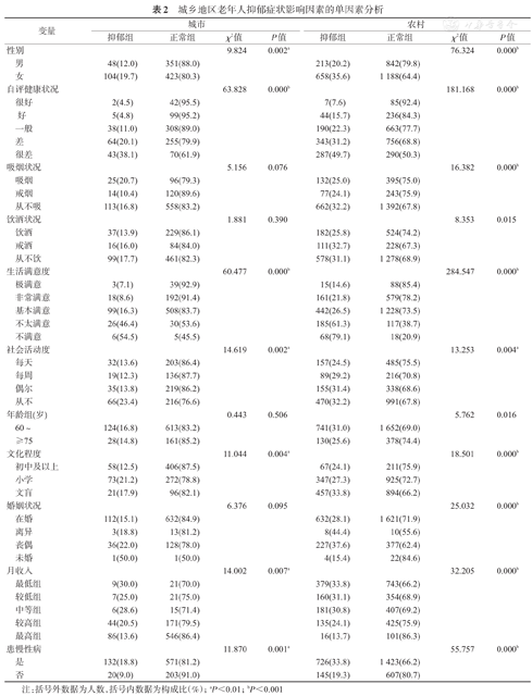 城乡地区老年人抑郁症状影响因素的单因素分析