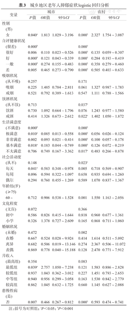多因素分析显示,月收入是城市老年人发生抑郁症状的影响因素(P<0.05)。城市老年人最低收入组抑郁症状发生率高于最高收入组(OR=2.757,P<0.05)。年龄、饮酒状况是农村老年人发生抑郁症状的影响因素(P<0.05)。60~岁组抑郁症状发生率高于≥75岁组(OR=1.550,P<0.001);戒酒的老年人抑郁症状发生率高于从不饮酒者(OR=1.402,P<0.05)。见表3。无论城乡地区,性别、自评健康、慢性病患病情况、社会活动度都是老年人发生抑郁症状的影响因素(P<0.05)。女性抑郁症状发生率高于男性;自评健康状况差的老年人抑郁症状发生率高于自评健康好的老年人;患慢性病的老年人抑郁症状发生率高于不患慢性病的老年人;从不进行社会活动的老年人抑郁症状发生率高于每天进行社会活动的老年人。