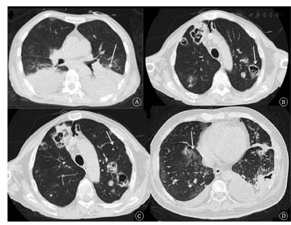 注:A. 例6患者胸部CT表现为双肺实变影(箭头所示);B. 例5患者胸部CT表现为多发空洞影(箭头所示);C. 例5患者胸部CT表现为多发结节影(箭头所示);D. 例2患者胸部CT表现出磨玻璃影(箭头所示)和实变影。