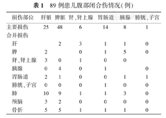 本组89例患儿,男60例,女29例,年龄7个月~13岁,平均5.38岁。根据主要损伤部位:肝挫裂伤25例,脾挫裂伤48例,胃肠道损伤14例,胰腺损伤8例,6例肾、肾上腺挫伤,1例子宫、膀胱损伤。其中车祸伤50例,坠落伤32例,打击伤2例,挤压伤4例,其他原因致伤1例,无死亡病例。腹部损伤多数为复合伤,腹腔脏器合并损伤情况见表1。