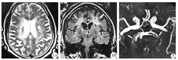 1A:矢状位T2WI,双侧侧脑室旁见对称晕状高信号(箭头所示);1B:冠状位T1 FLAIR,双侧额顶叶皮层下可见多个高信号(箭头所示);2:提示颅内动脉僵直,双侧大脑后动脉分支稀少(箭头所示)