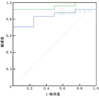 采用受试者工作特征(ROC)曲线评价大、小剂量DST对诊断库欣病和EAS的敏感度和特异度,以大、小剂量DST服药后/服药前的24 h UFC比值为诊断指标,以是否库欣病为状态变量,建立ROC曲线(图1)。结果显示,小剂量DST的曲线下面积(AUC)为0.833,取曲线最左上方的点即敏感度和特异度之和最大为临界点,小剂量DST的服药后/服药前24 h UFC比值的临界值为0.65,诊断库欣病的敏感度为70.8%,特异度为100%。大剂量DST的AUC为0.948,服药后/服药前的24 h UFC比值的临界值为0.54,诊断库欣病的敏感度为91.7%,特异度为100%。