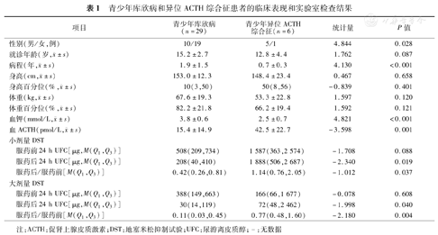 | 项目 | 青少年库欣病(n=29) | 青少年异位ACTH综合征(n=6) | 统计量 | P值 | |