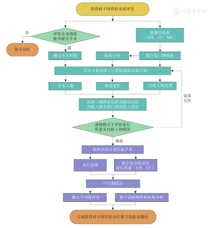 近年来,数字化技术使医学影像学诊断从定性诊断发展为精准定量化诊断。骨科数字化技术带来的海量图像数据多重应用为创建新型医疗模式、建立合理的骨科疾病临床路径及循证医学发展需求提供了必要的技术基础。因此,本文提出基于计算机辅助骨科技术的股骨转子间骨折治疗策略的临床路径,供广大临床医生共同探讨(图1)。