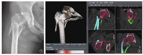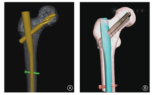 目前,多层螺旋CT及三维重建技术已普遍应用于骨与关节创伤的诊断。基于多排螺旋CT技术的容积重建法(volume rendering,VR)、多平面重组成像模式(multiplanar reconstruction,MPR)、表面遮盖重建法(surface shaded display,SSD)等成像技术已呈现出多元化发展趋势[8]。基于DICOM国际标准数据构建的先进数字骨科技术,通过重建CT检查的原始数据而输出带比例尺的高精度、结构丰富的股骨近端三维图像及多重伪彩渲染的MPR图像,并在术前进行自由视角观察与操作,包括自由分割、自由选择剖面、二维、三维联动显示、实时交互、旋转、平移、缩放等,可保存任意观察角度。该方法可实现股骨颈干角、股骨头颈中轴线长度、股骨干内外径的精确三维测量,弥补了传统影像学评估的不足。因此,智能化的数字骨科技术将明显提高临床医生对股骨转子间骨折损伤细节的全方位把握,利于术前设计的制定,方便临床医生及时总结临床经验,从而提高临床疗效(图2)。