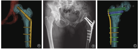 PFP与股骨近端解剖形态的匹配度高,可重建股骨外侧壁的完整性,近端3枚螺钉分别与钢板呈多角度、多平面的方向置入头颈部,具有较好的防旋和抗剪切力,使得转子间骨折获得理想的对位、对线。锁定螺钉与钢板之间通过锁定孔进行固定后,能够有效预防颈干角变小、骨折部位成角畸形。对于股骨髓腔较细、前弓大或股骨先天性畸形,髓内钉置入困难者,亦可选择PFP固定。应用PFP治疗股骨转子间骨折时,由于股骨近端形态学存在个体间的差异,术中可适当调整钢板的位置,以确保股骨近端3枚螺钉能够准确置入到股骨颈内。在临床工作中,对一些特殊类型的股骨转子间骨折,如小儿麻痹症患者的骨折,其骨骼髓腔较为狭窄,选用PFP治疗更适宜(图5B)。