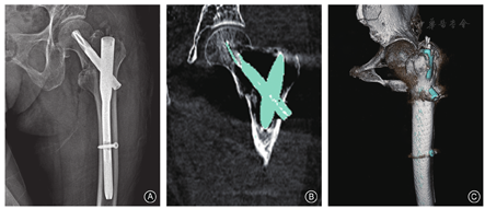 关于股骨转子间骨折术后复位质量评估,可在术后2周时行X线片及CT检查,而后进行数字化分析及精细评估。数字化技术在术后的影像学随访中,可通过不同的内植入物提取模式结合三维容积重建技术、自由截面选择的MPR技术等精确观察股骨转子间骨折术后的骨折块复位质量、内固定置放情况,从而科学指导患者术后的肢体功能锻炼进程(图7)。